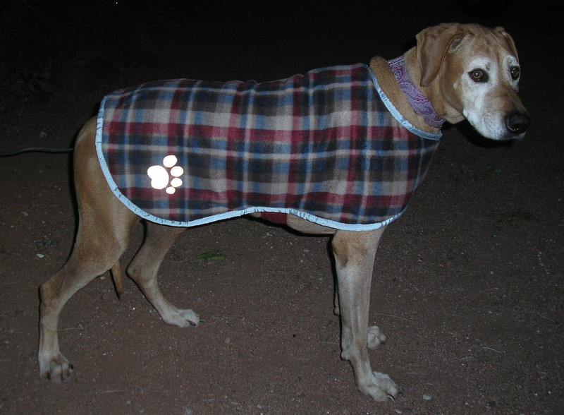 It is REVERSIBLE and really nice! It has reflective strips and paw print patterns on each side so it's great for night walks. The red side is water resistant with the plaid fleece lining. Reverse it, and the fleece side (also with reflective strips) gives a change of pace when water resistance isn't needed. It's shown on the 90 pound Rhodesian Ridgeback, Auggie and actually fits him pretty well, though could fit a slightly less muscular dog a bit better. It has wide, strong velcro closures in the front, and underneath.This is for a dog approx. 24" from the base of the neck to the base of the tail. Suggested breeds are Collie, Golden Retriever, Lab, Vizsla, Weimeraner, Dalmatian, and I believe it would work well for a large Greyhound/Galgo.